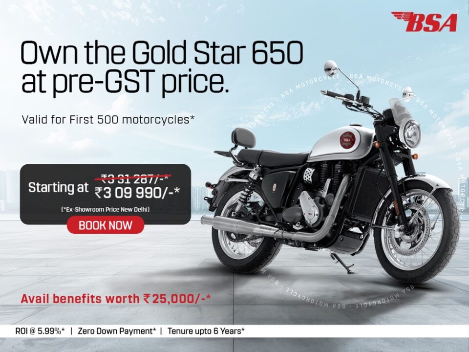 PUNE | 24th SEPTEMBER 2025: BSA Motorcycles brings festive cheer this Navratri with a limited-period offer for the first 500 buyers of its flagship Gold Star 650. As the lucky customers secure their Gold Star at pre-GST 2.0 prices, they will also receive an exclusive limited-edition accessory kit. The recent GST revision increased levies on motorcycles above 350cc from 28 percent to 40 percent, but BSA continues to prioritise customer satisfaction. It is absorbing the price impact to offer enthusiasts a unique riding experience at a compelling value.