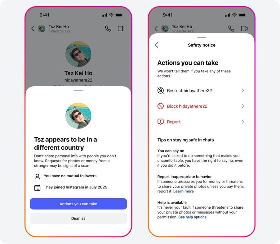 In June, teens and young adults also saw our new Location Notice on Instagram 1 million times. This notice lets people know when they’re chatting with someone who may be in a different country, and is designed to help protect people from potential sextortion scammers who often misrepresent where they live. Over 10% tapped on the notice to learn more about the steps they could take.